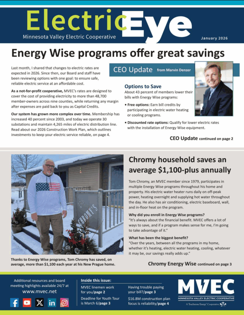 Stay informed with our monthly newsletter Want to go paperless? Sign up to receive the Electric Eye electronically. Read January Electric Eye newsletter January bill insert: Go Paperless Learn more about REBATES Previous 2026 issues: January 2026 Newsletters from 2025 December 2025 November 2025 October 2025 September 2025 August 2025 July 2025 June 2025 May 2025 April 2025 March 2025 February 2025 January 2025 Newsletters from 2024 December 2024 November 2024 October 2024 September 2024 August 2024 July 2024 June 2024 May 2024 April 2024 March 2024 February 2024 January 2024